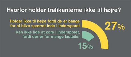 • 27 % holder ikke til højre, fordi de er bange for at blive spærret inde i indersporet, mens 15 % siger, at de ikke kan lide at køre i indersporet, fordi der er for mange lastbiler.