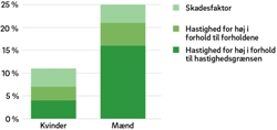 Hastighedsoverskridelser var 4 gange så ofte ulykkesårsag for mænd som for kvinder Overskridelser af hastighedsgrænsen var for 16% af mændene i undersøgelsen medvirkende til, at ulykken skete. For kvinderne var det kun tilfældet for 4%. Hvis man ser på det at køre for hurtigt i forhold til forholdene (i forhold til f.eks. vejrforhold, lys, trafik, vejforløb m.v.), så var der ikke så stor forskel mellem kønnene. For 5% af mændene i undersøgelsen skyldtes ulykken, at de kørte for stærkt i forhold til forholdene, mens det gjaldt for 3% af kvinderne.