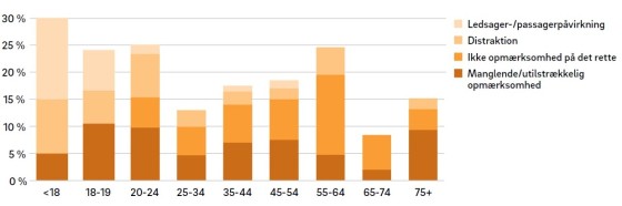 Distraktion sås oftest som medvirkende årsag i ulykker med trafikanter under 25 år Distraktion var oftest medvirkende til ulykker med de yngre (trafikanter under 25 år) i undersøgelsen, og påvirkning fra passagerer og ledsagere sås næsten udelukkende hos børn og unge under 20 år. Hos de øvrige aldersgrupper var uopmærksomhed en ulykkesårsag i nogenlunde samme omfang.