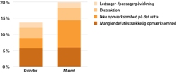 Uopmærksomhed var et lige så stort problem for kvinder som for mændUopmærksomhed var i næsten samme omfang medvirkende til ulykker for mænd og kvinder i undersøgelsen. Uopmærksomhed optrådte på mange forskellige måder. Der var situationer, hvor trafikanterne var distraheret af noget, der ikke havde med kørslen at gøre – enten inde i eller uden for bilen - eller hvor trafikanten faldt i staver og ikke holdt øje med trafikken forude (f.eks. ved kørsel på en ensformig strækning i lang tid). Der var også situationer, hvor trafikanten var for optaget af noget i trafikken, så andre vigtigere forhold blev overset. F.eks. en svingende bilist, der fokuserede på andre biler og derfor overså en fodgænger. Denne sidste form for uopmærksomhed var lidt hyppigere medvirkende til ulykken for mænds vedkommende end for kvinders.