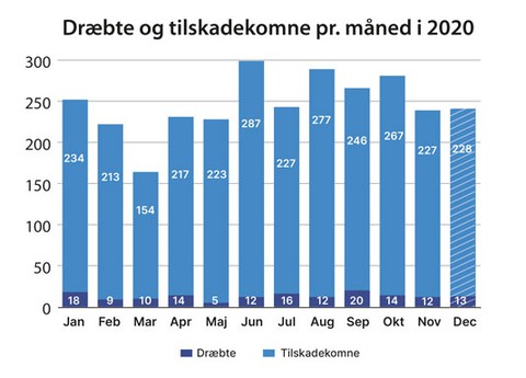 De foreløbige ulykkestal fra Vejdirektoratet viser, at 155 personer mistede livet i trafikken i år. Dermed ser 2020 ud til at blive året med færrest trafikdræbte siden før 1930. Det hænger i høj grad sammen med nedgangen i trafikken på vejene på grund af Corona-restriktionerne.