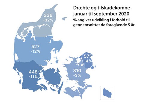 Hvad angår de tilskadekomne i 2020, så er de faldet med cirka 10 procent i forhold til gennemsnittet de seneste fem år. Der var især færre tilskadekomne i personbil og på cykel. Det skyldes blandt andet, at der har været et stort fald i personbiltrafikken som følge af Corona-restriktionerne. Der var dog hverken færre dræbte i personbil eller på cykel, i årets første 3 kvartaler, end der har været de foregående år.