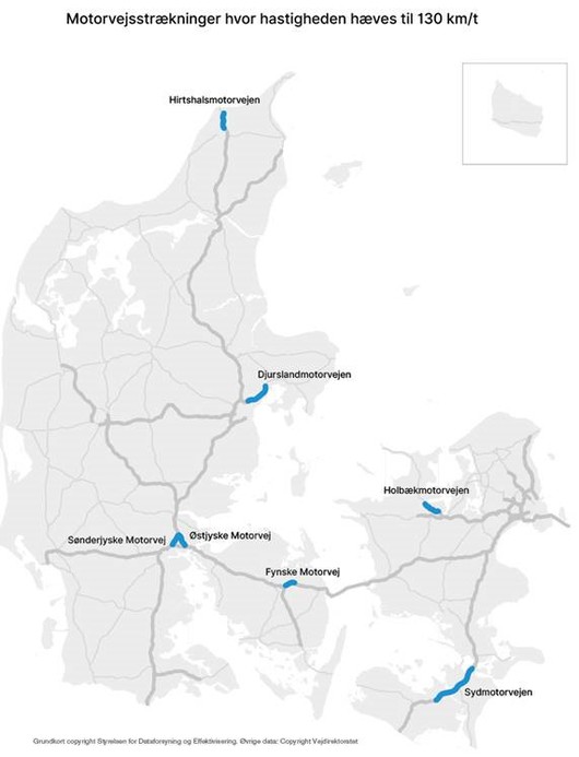 På disse motorvejsstrækninger bliver hastighedsgrænsen hævet fra 110 til 130 km/t: