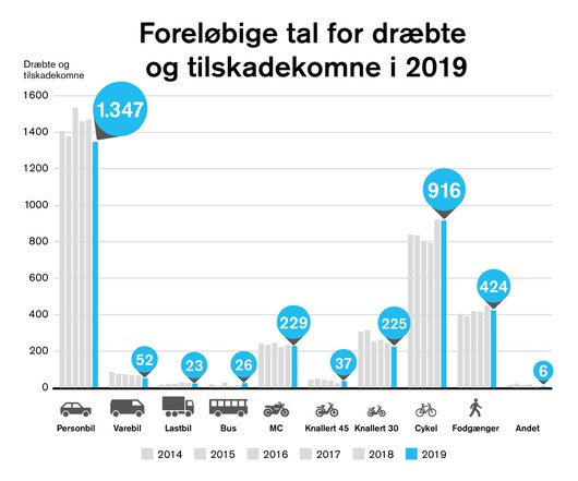 Der er stadig flest, der kommer til skade eller bliver dræbt i personbil, men antallet er faldet de senere år. Antallet af dræbte og tilskadekomne cyklister var lavere i 2019 end i 2018, men højere end i de foregående år. I 2019 var der flere dræbte og tilskadekomne på el-cykel og færre på almindelige cykler end i 2018.