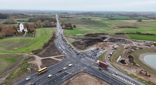 Da vi flyttede trafikken fra det midlertidige kryds til det nye kryds, gav det kødannelse og forsinkelser. Vi er klar over, at det havde været lettere for trafikanter at bruge det midlertidige kryds lidt længere, men det var nødvendigt at flytte trafikken, så entreprenøren kunne etablere cykelsti og kørebane dér, hvor det midlertidige kryds lå.