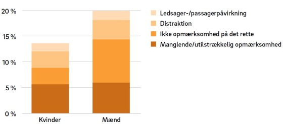 Uopmærksomhed var et lige så stort problem for kvinder som for mændUopmærksomhed var i næsten samme omfang medvirkende til ulykker for mænd og kvinder i undersøgelsen. Uopmærksomhed optrådte på mange forskellige måder. Der var situationer, hvor trafikanterne var distraheret af noget, der ikke havde med kørslen at gøre – enten inde i eller uden for bilen - eller hvor trafikanten faldt i staver og ikke holdt øje med trafikken forude (f.eks. ved kørsel på en ensformig strækning i lang tid). Der var også situationer, hvor trafikanten var for optaget af noget i trafikken, så andre vigtigere forhold blev overset. F.eks. en svingende bilist, der fokuserede på andre biler og derfor overså en fodgænger. Denne sidste form for uopmærksomhed var lidt hyppigere medvirkende til ulykken for mænds vedkommende end for kvinders.