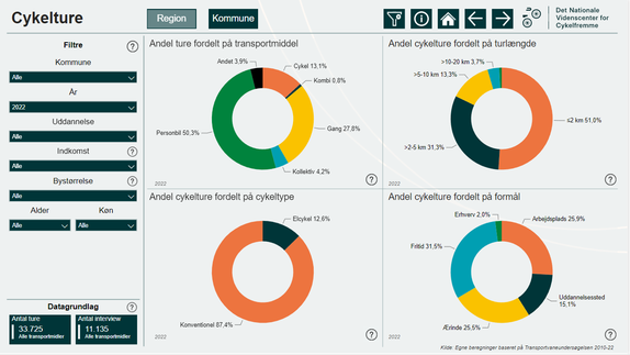 Find det nationale cykelregnskab på cykelviden.dk og fortsæt egne analyser af alt fra kørte kilometer på cykel, kilometer cykelsti i by og land, tilfredshed med cykelforhold blandt cyklister i landets kommuner og meget mere.
