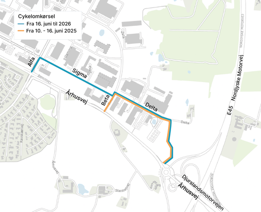 Fra mandag den 16. juni skal cyklister køre gennem erhvervsområdet hele vejen fra Alfa-krydset frem til E45 Østjyske Motorvej. I erhvervsområdet vil der være omkørsel via Alfa, Sigma, Beta, Delta samt den nye midlertidige dobbeltrettede cykelsti frem til Motorvejskryds Aarhus N. Langs Sigma er Favrskov Kommune ved at etablere cykelstier, som netop står klar mandag den 16. juni.