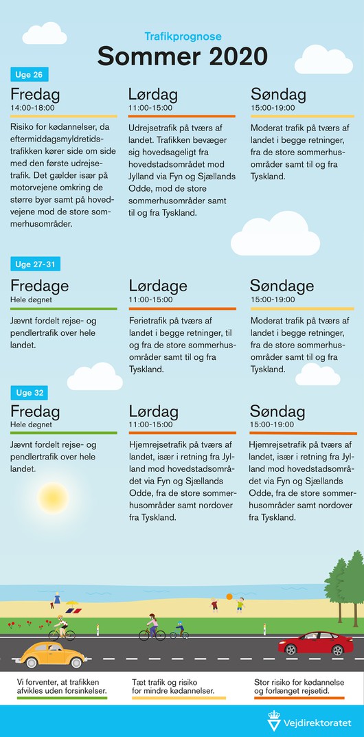 Skolernes sommerferie starter fredag den 26. juni, og derfor forventer vi, at den første bølge med sommerferietrafik vil ramme de store veje allerede fra denne fredag om eftermiddagen, og den vil sandsynligvis fortsætte resten af den pågældende weekend med størst risiko for køer og forlænget rejsetid om lørdagen fra kl. 11.00 – 15.00.