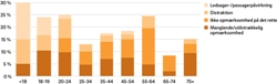 Overskridelser af hastighedsgrænsen aftog med alderen som medvirkende årsag til ulykkenMed alderen blev det mindre og mindre hyppigt, at det var hastighedsoverskridelser, der medvirkede til ulykken: For 30 % af undersøgelsens unge mellem 18 og 24 år var deres hastighedsoverskridelse medvirkende til, at ulykken skete. For trafikanter over 35 år gjaldt det kun for ca. 10 % eller derunder.