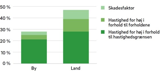 For høj hastighed var et betydeligt problem både i by og på land I op mod en tredjedel af ulykkerne i byzone var for høj hastighed medvirkende til, at ulykkerne skete, eller at personskaderne blev alvorligere. Det var således et betydeligt problem i lighed med landzone, hvor det medvirkede til ca. halvdelen af ulykkerne og skaderne.