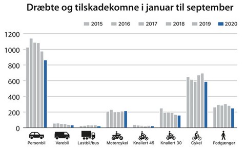Hvad angår de tilskadekomne i 2020, så er de faldet med cirka 10 procent i forhold til gennemsnittet de seneste fem år. Der var især færre tilskadekomne i personbil og på cykel. Det skyldes blandt andet, at der har været et stort fald i personbiltrafikken som følge af Corona-restriktionerne. Der var dog hverken færre dræbte i personbil eller på cykel, i årets første 3 kvartaler, end der har været de foregående år.