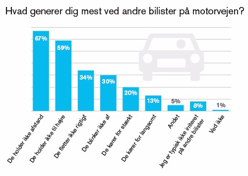 Men det skaber ikke kun et bedre flow i trafikken at vise hensyn og holde til højre. Det giver også større køreglæde. Vejdirektoratet har spurgt danskerne, hvad der generer dem allermest ved andre bilister, og de fleste er mest generet af bilister, der ikke holder til højre og ikke holder afstand.