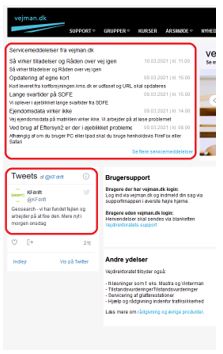 Illustrationen: På vejman.dk forside vises driftsmeddelelser fra vejman.dk øverst til venstre (indrammet med rødt) og fra Kortforsyningen under Tweets, KFdrift (indrammet med rødt).