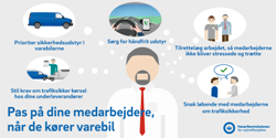 - Tilrettelæg arbejdet, så der indgår pauser, så tidspres undgås, så lange arbejdsdage og natarbejde så vidt muligt undgås, og så arbejdsrelaterede beskeder ikke gives under kørslen.