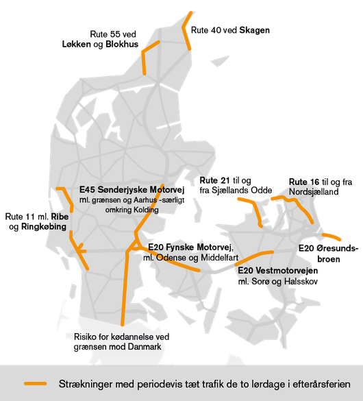 Her skal trafikanterne forberede sig på tæt trafik og periodevise forsinkelser, især på motorvej E20 i vestgående retning fra hovedstadsområdet mod Jylland samt på E45 Sønderjyske Motorvej.